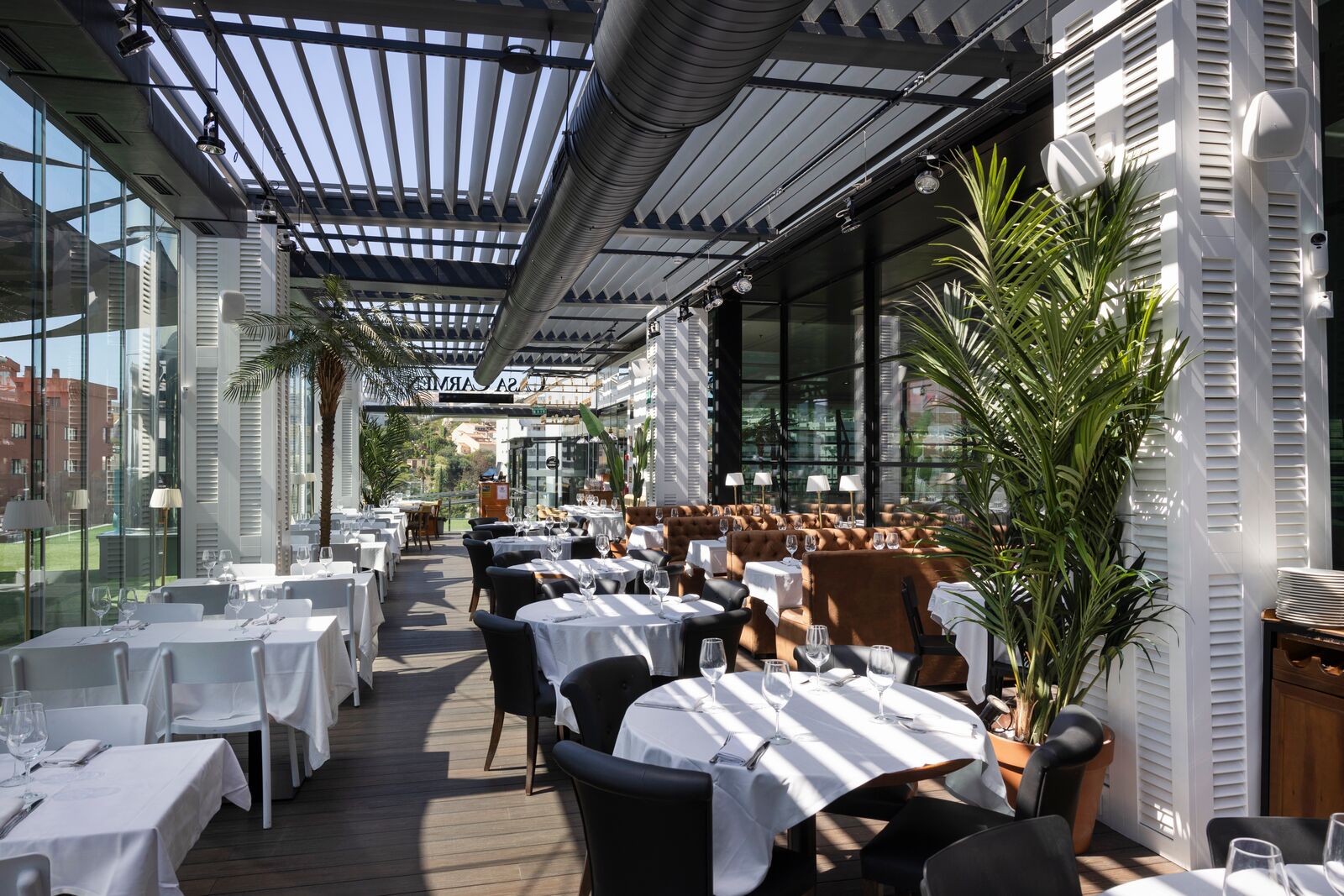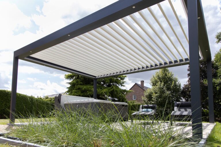 Sonnenregulierende und wasserdichte Terrassenüberdachung mit motorbetriebenen Lamellen