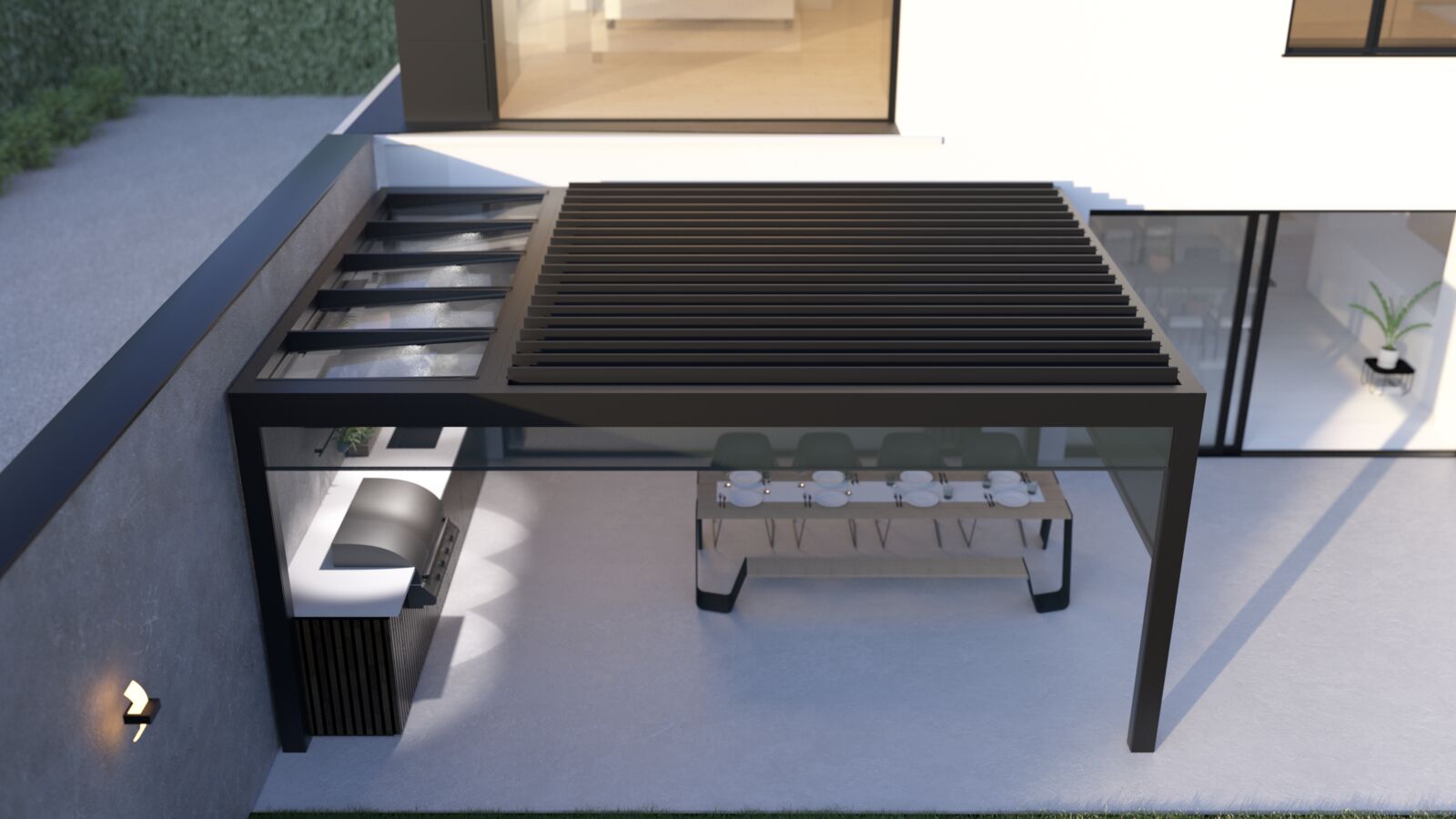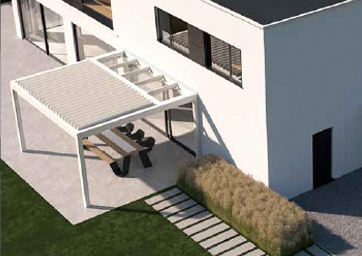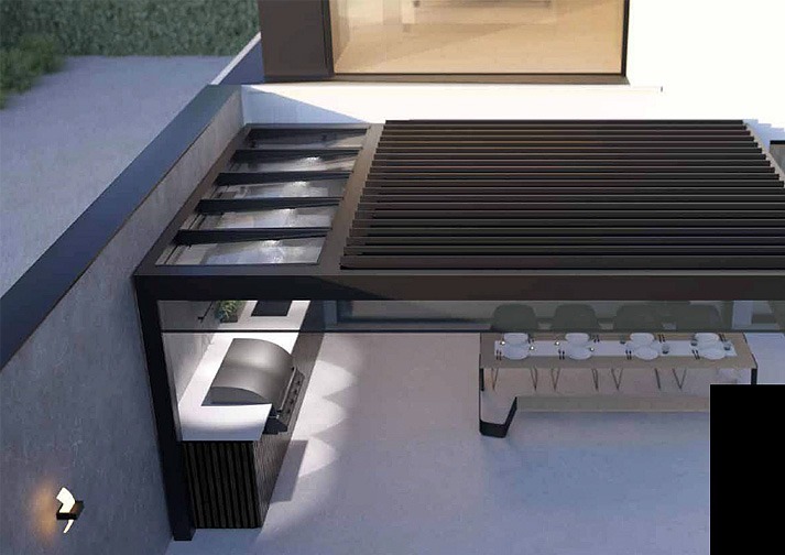 Das Modell B-720 ist die ultimative flexible Terrassenüberdachung. Die Kombination aus einem festen Dachteil aus Glas oder Sandwichpaneelen mit einem Dachteil mit kippbaren Lamellen eröffnet unzählige Möglichkeiten. Ein trockener Bereich, in dem Sie Ihre Möbel oder Ihre Außenküche aufstellen können, eine Überdachung für eine stilvolle Bar oder eine Gartenaufbewahrung in Kombination mit einer gemütlichen Terrasse.