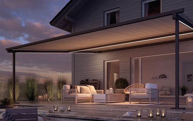 Die horizontale Beschattung sorgt für optimalen Schutz und ist je nach Ausführung auch wasserdicht. Optional schützt eine Senkrechtbeschattung vor Sonne, Wind und neugierigen Blicken. Ebenfalls erhältlich ist eine optionale Seiten- und Frontverglasung, die vor Wind und Regen schützt, ohne die Aussicht zu trüben, und so auch bei schlechtem Wetter noch Terrassengenuss ermöglicht.